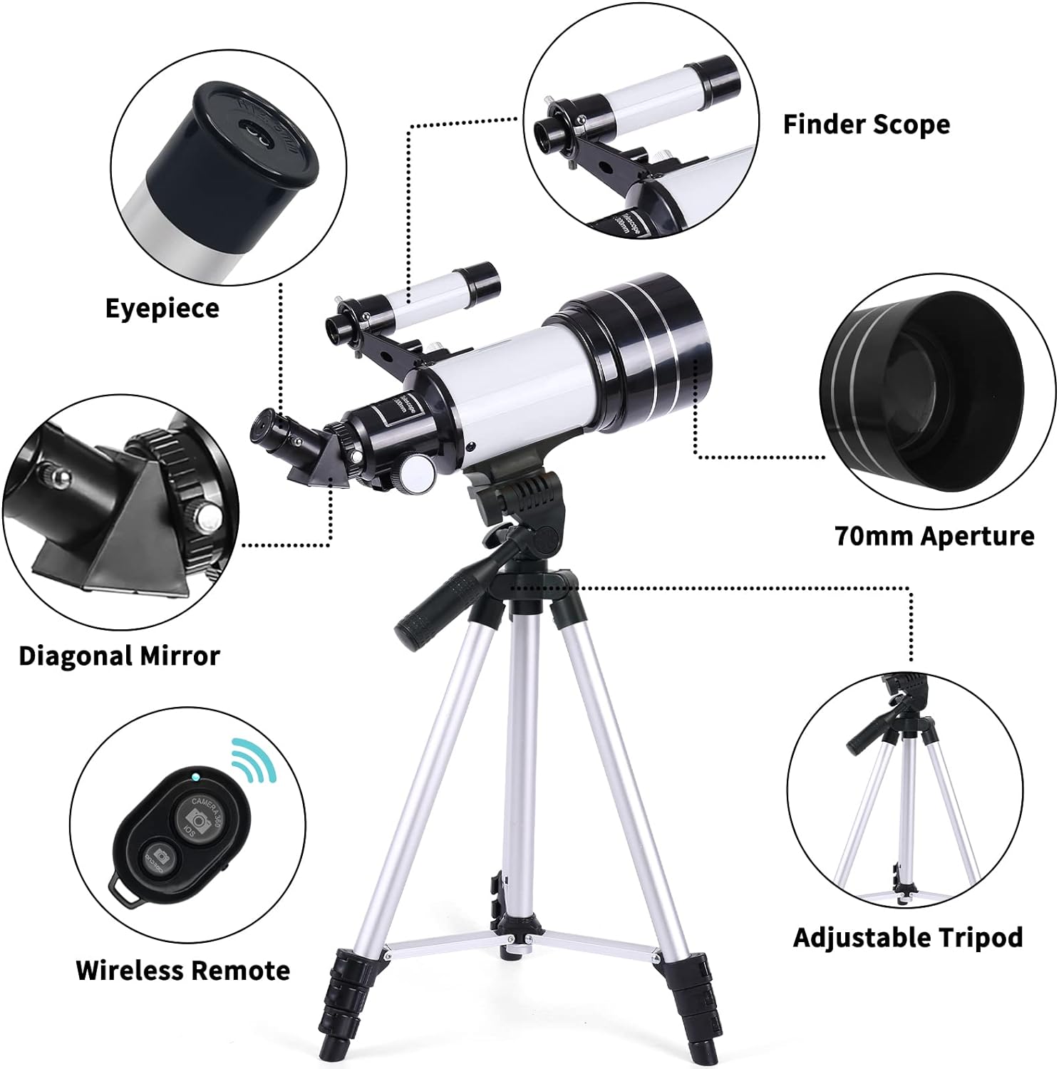 Telescope for Adults & Kids, 300mm Focal Length Refractor Telescope, 70mm Aperture Professional Astronomy Refractor Telescope for Beginners, Phone Adapter & Wireless Remote (White)